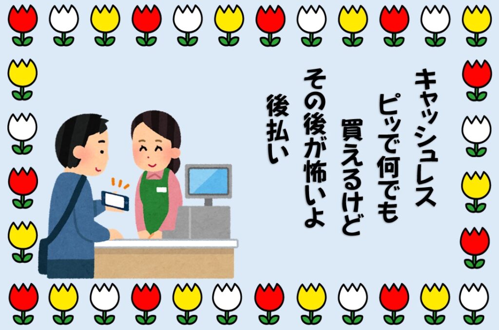 現金払いのうちは財布の中身と相談して自粛していたが、目に見えないとついつい使ってしまい、あとから多額の請求がくる恐ろしさを歌いました。